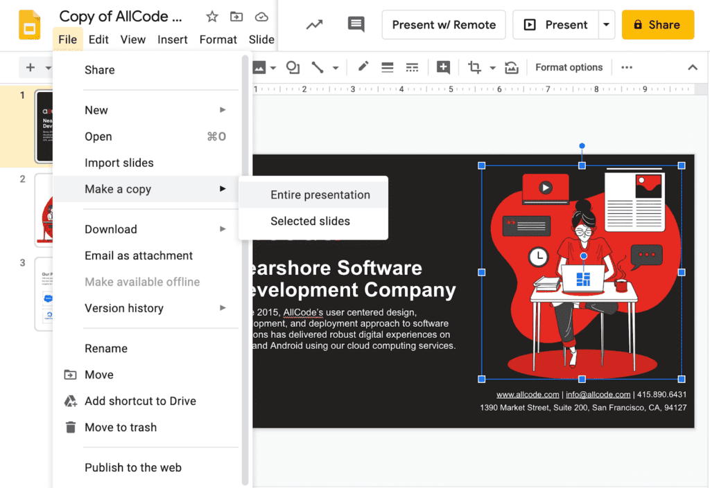 Find and open the project that you wish to extract the graphics from and make a copy, choosing to copy the entire presentation or only selected slides. By duplicating your project, you won’t worry about disturbing your original version.